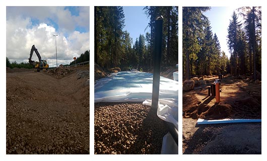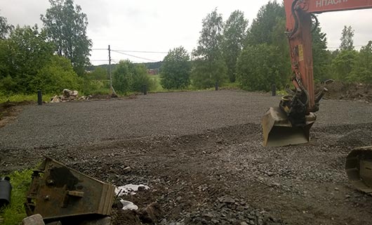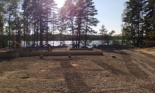 Aloitamme tontin raivauksella, jolloin tarvittavat puut kaadetaan ja pintamaa kuoritaan. Tämän jälkeen pohja leikataan korkoon, tehdään tarvittavat täytöt, asennetaan salaojat, viemäri- ja muut tarvittavat putket.